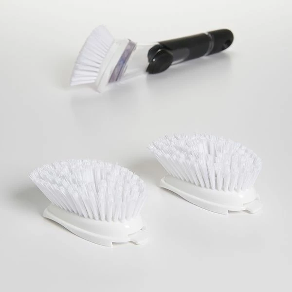 This OXO Good Grips Soap Squirting Dish Brush Refill set contains 2 x dish brush refills made for the Oxo Soap Dispensing Dish Brush. Simply push up on the tab to eject the old brush head and attach the new one by simply sliding it on. The durable nylon bristles easily scrub away baked-on food and are safe for non-stick cookware. Dimensions: 6.35cm x 2.54cm x 8.89cm.