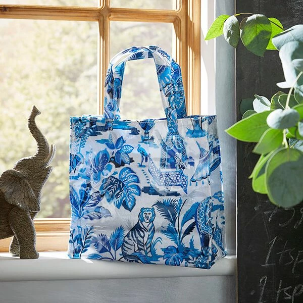 The Ulster Weavers India blue small PVC shopping bag is perfect for carrying everyday essentials. The ornate design of India Blue is inspired by the indian jungle. Using inspiration from willows, elephants, tigers and monkeys in range of blues enjoying the ancient temple surroundings. The small PVC bag can be reused and wipes clean with a damp cloth.