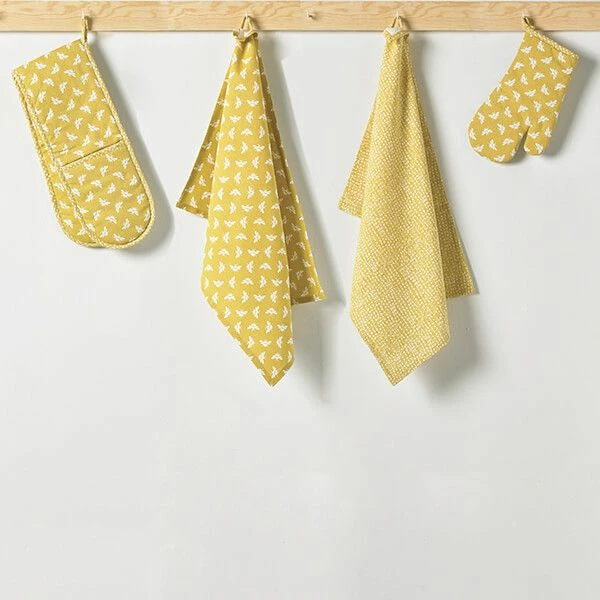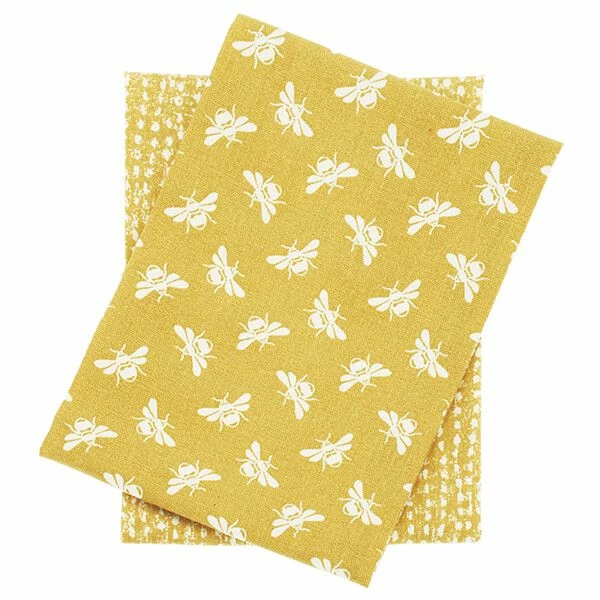 Walton & Co Set of 2 Ochre Bee Tea Towels contains 1 x tea towel with a terrific bumble print and 1 x tea towel with a gorgeous dotted stripe design.