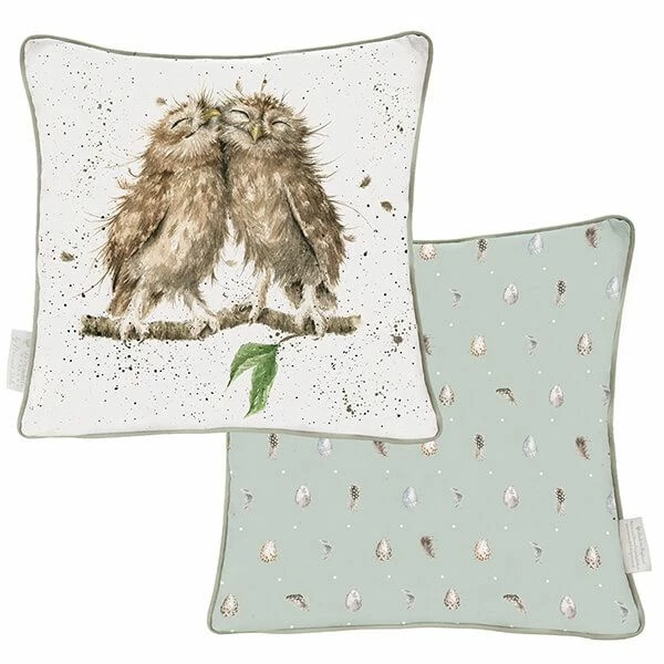 Make a statement with this Wrendale ‘Birds of a Feather’ Large Cushion. Made in England from a high quality cotton-linen blend this Wrendale 60cm square cushion is feather filled and has complementary green piping. The illustration of two cute owlets cuddling on the front of this statement cushion is augmented by a coordinating illustration on the reverse.